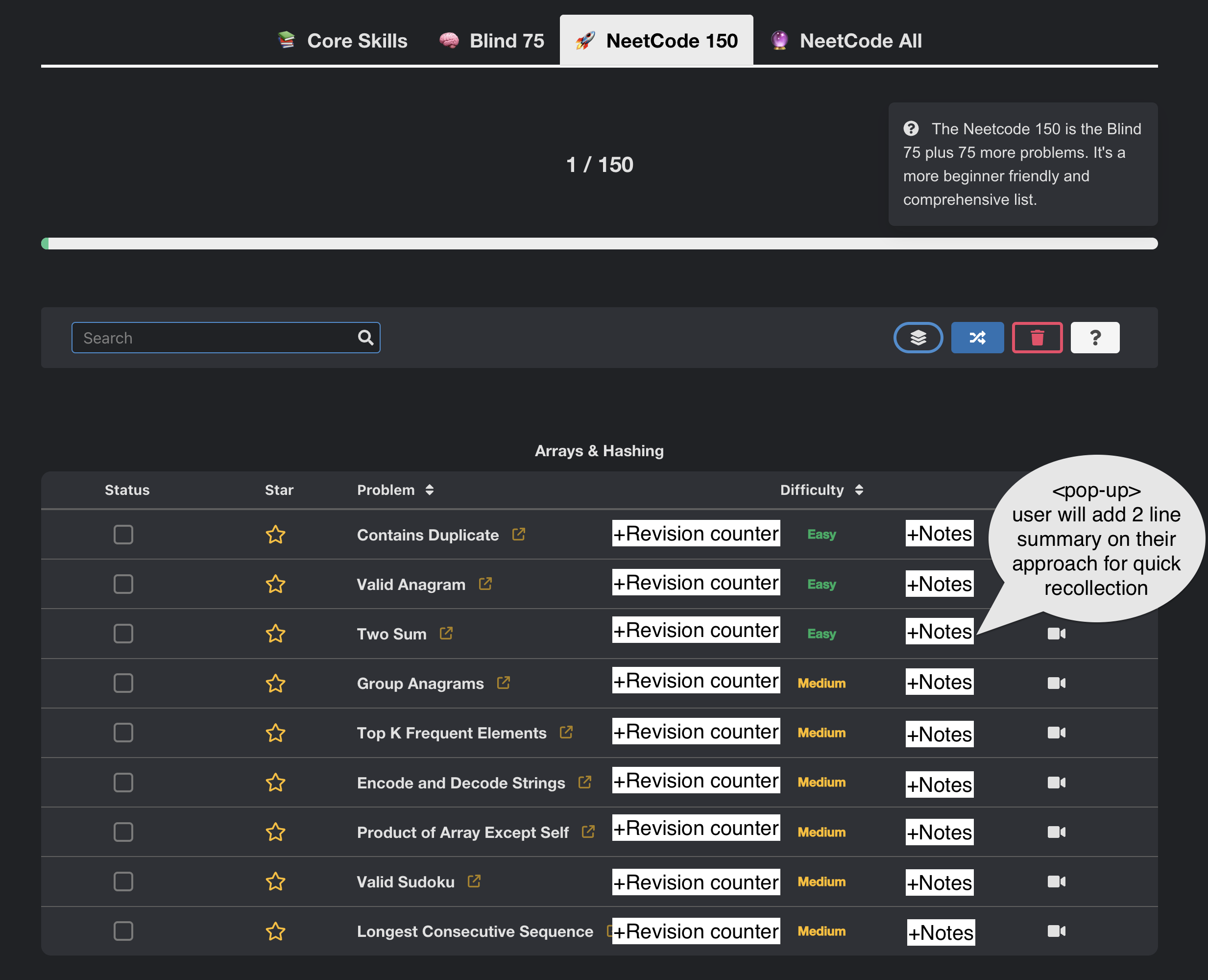 feature req 1: consider adding Notes feature against NC150/Blind75 list for editable 2 line summary. This will help to recollect thoughts on a specific problem instantly.